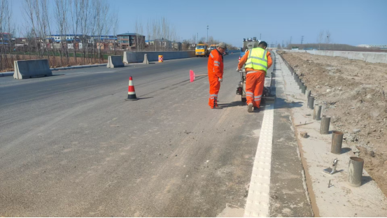 施工現(xiàn)場(chǎng),施工人員組織安全技術(shù)交底,對(duì)現(xiàn)場(chǎng)的安全、保通措施、標(biāo)線外觀、質(zhì)量做出詳細(xì)安排后,大家分工明確,熱火朝天的干起來(lái)。標(biāo)線施劃中,他們嚴(yán)格遵循施工標(biāo)準(zhǔn)與規(guī)范,從前期的場(chǎng)地清理,確保地面干凈、無(wú)雜物,為標(biāo)線施劃提供良好基礎(chǔ),到精準(zhǔn)測(cè)量標(biāo)線位置,每一個(gè)環(huán)節(jié)都容不得半點(diǎn)馬虎。熱熔標(biāo)線施劃時(shí),操作人員熟練地控制著機(jī)器,使標(biāo)線的寬度與厚度均勻一致、逆反射系數(shù)合格。在他們精心操作下,一條條嶄新的標(biāo)線在陽(yáng)光下熠熠生輝,與平坦的道路相得益彰。